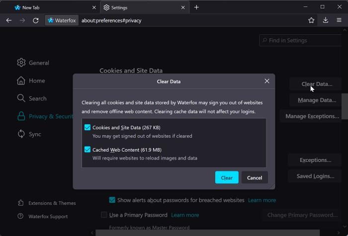 Doing this will clear out all the cookies and cache data stored on Waterfox and thereby fix the browser’s issue if that’s the reason behind it.